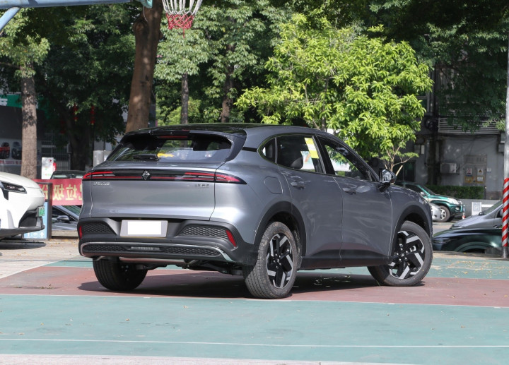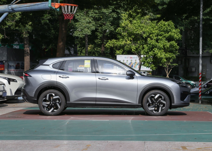 再来看新车的车身侧面部分,侧面采用上扬腰线设计,标配18英寸双色花瓣轮毂(225/55 R18轮胎),黑色轮眉与银色窗线形成精致对比。悬浮式车顶通过黑化B/C/D柱实现,充电口位于左后翼子板(快充0.33小时可达80%电量)。半隐藏式门把手平衡风阻与实用性。尺寸保持4590×1880×1608mm(纯电版4541mm车长),轴距2750mm,介于比亚迪元PLUS与AION Y之间。大尺寸的车身让车内后备箱标准容积567L(纯电版略小),后排4/6放倒后可扩展至1570L,轻松容纳5个28寸行李箱。全车29处储物空间包括门板雨伞槽与座椅后背袋。